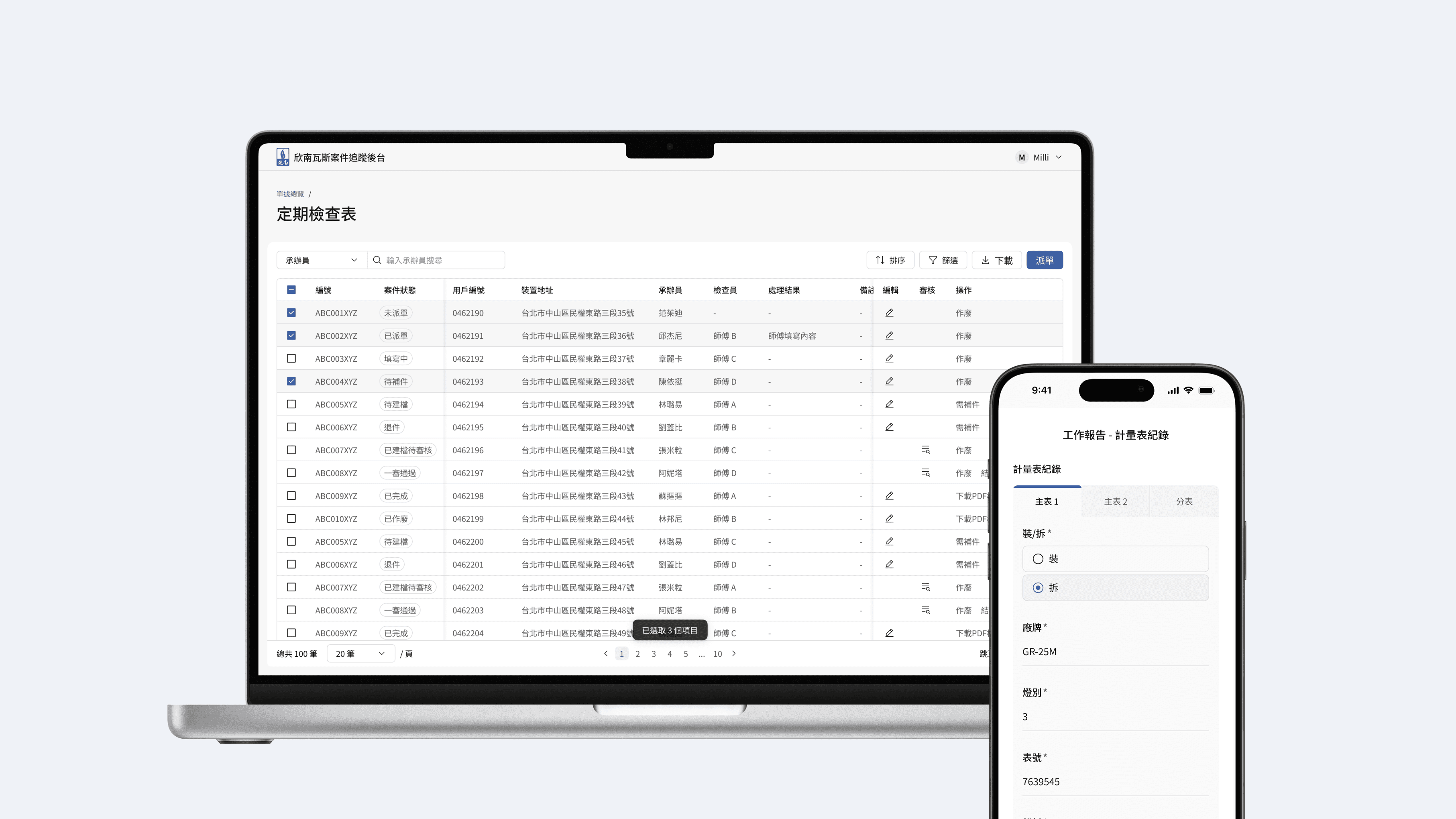 公司主動排程,批次派師傅定期檢查管線。師傅掃碼填表,完成後兩階段審核結案。